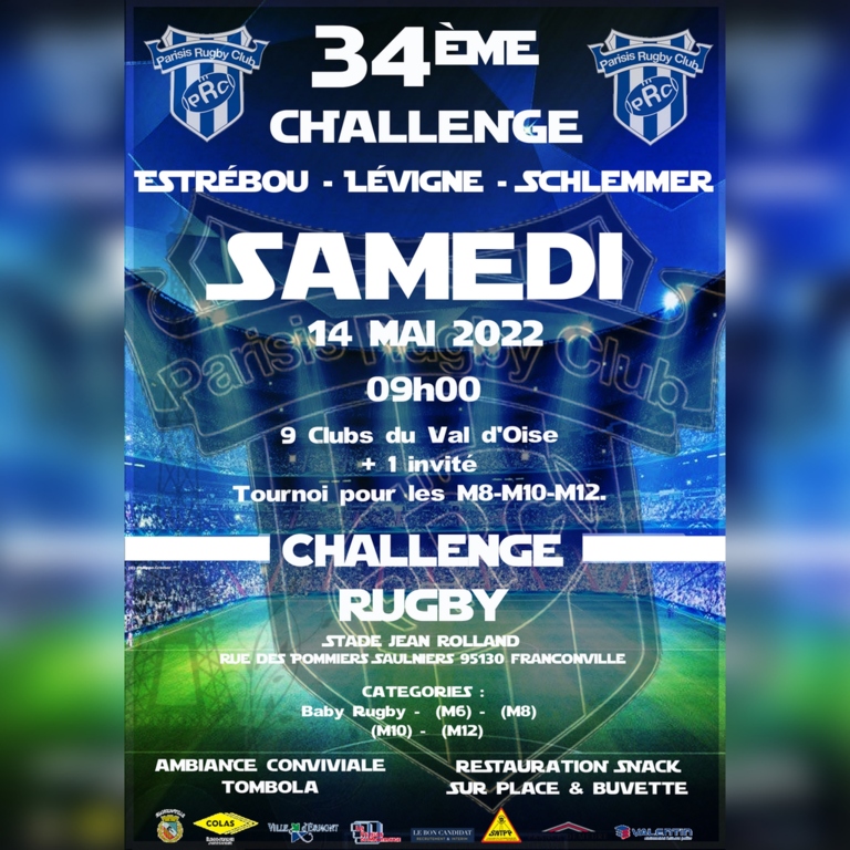 Challenge Estrébou-Lévigne-Schlemmer le SAMEDI 14 mai 2022 à partir de 9h00 challenge qui rassemble 9 écoles de rugby du Val-d'Oise + 1 équipe surprise (BBQ, Tombola, Buvette)