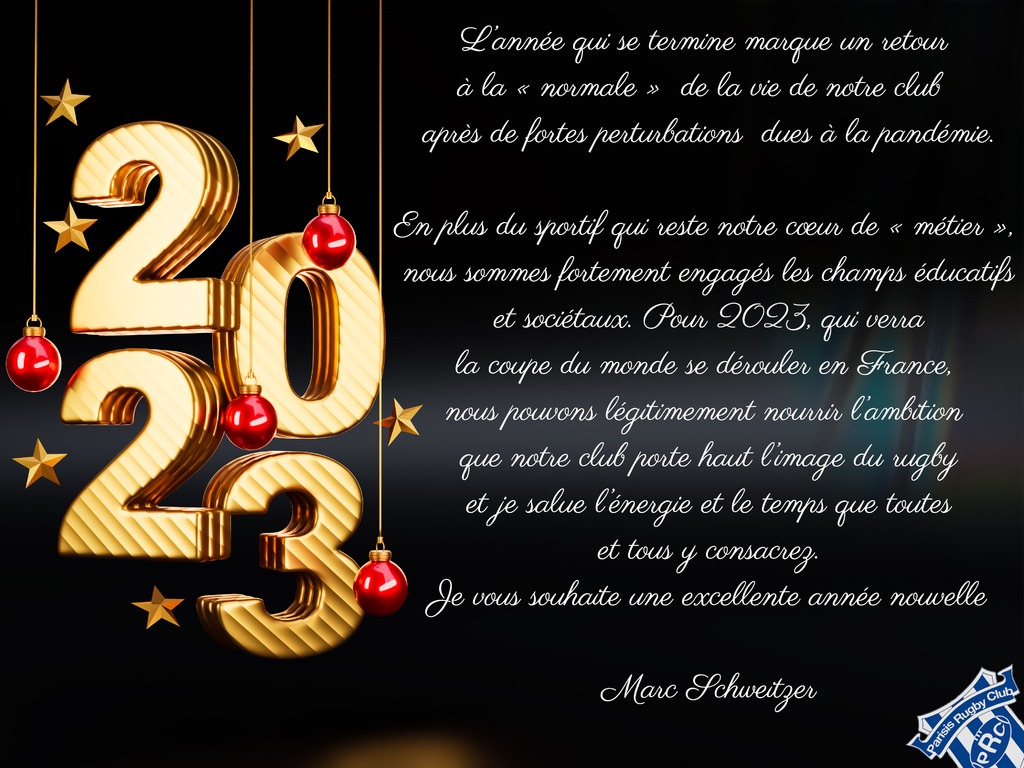 Pour 2023, qui verra la coupe du monde se dérouler en France, nous pouvons légitimement nourrir l’ambition que notre club porte haut l’image du rugby et je salue l’énergie et le temps que toutes et tous y consacrez.